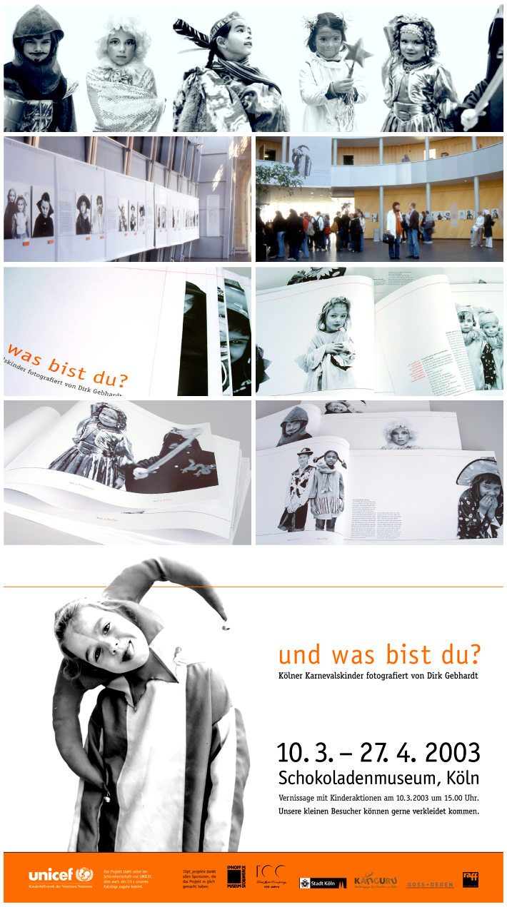 Ausstellung des Fotografen Dirk Gebhardt zu Gunsten des Unicef Kinderhilfswerks im Foyer des Schokoladenmuseums Köln, Inszenierung und begleitende Medien: Plakat, Katalog, Einladung